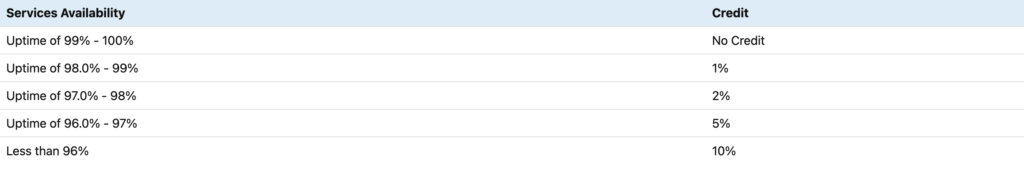 Remedies: The remedies stated in this Section are the Customer’s sole and exclusive remedies and OverseeAI’s sole and exclusive obligations for service interruption. In the event that OverseeAI is unable to provide the Availability objective noted below in any given calendar month, Customer will receive a credit on their next monthly invoice equal to the corresponding percentage noted below of one (1) month’s worth of the annual subscription fee for the Services for the month in which the Availability objective was not obtained, which will not exceed 10% of the fees due to OverseeAI for that calendar month (and, for clarity, does not include fees payable on Compute Units or additional Modules).